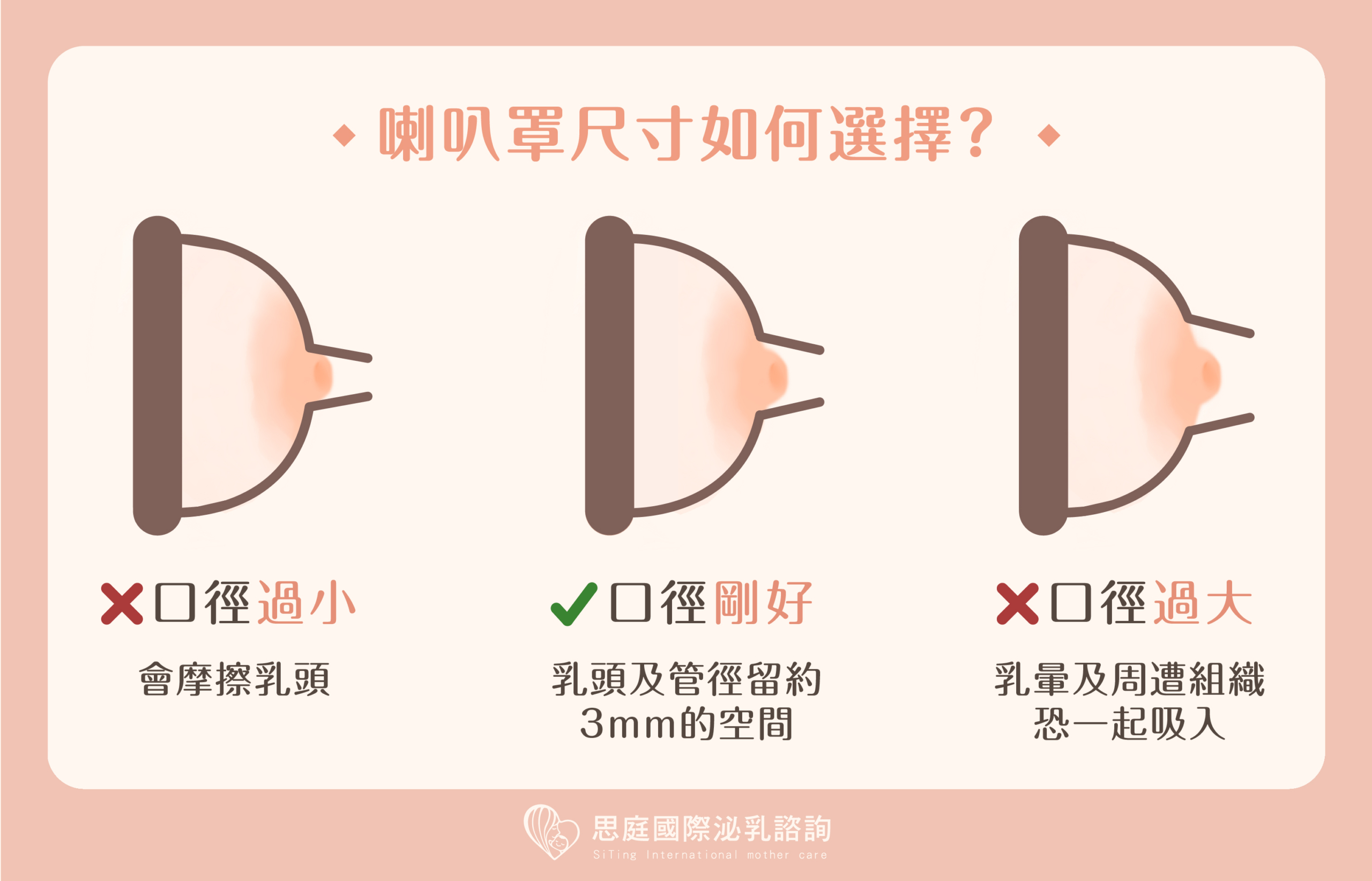 測量寬度:簡單將罩杯套在乳頭,以乳頭的邊界計算離喇叭罩的邊界是否間距 3mm。