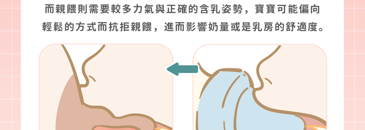 而瓶餵寶寶只需張開嘴、輕鬆的含住奶嘴頭就可以吸到奶,相較於起來,親餵是非常事倍功半模式。